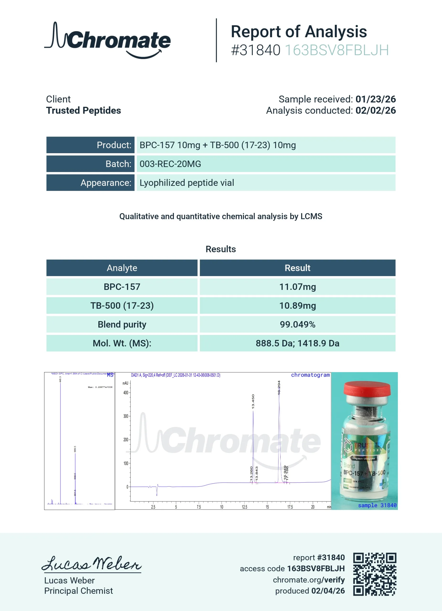 This powerful blend combines the localized, site-specific regenerative potential of BPC−157 with the systemic healing and anti-inflammatory properties of TB−500. It offers a comprehensive, synergistic approach to studying accelerated recovery, tissue repair, and mobility.