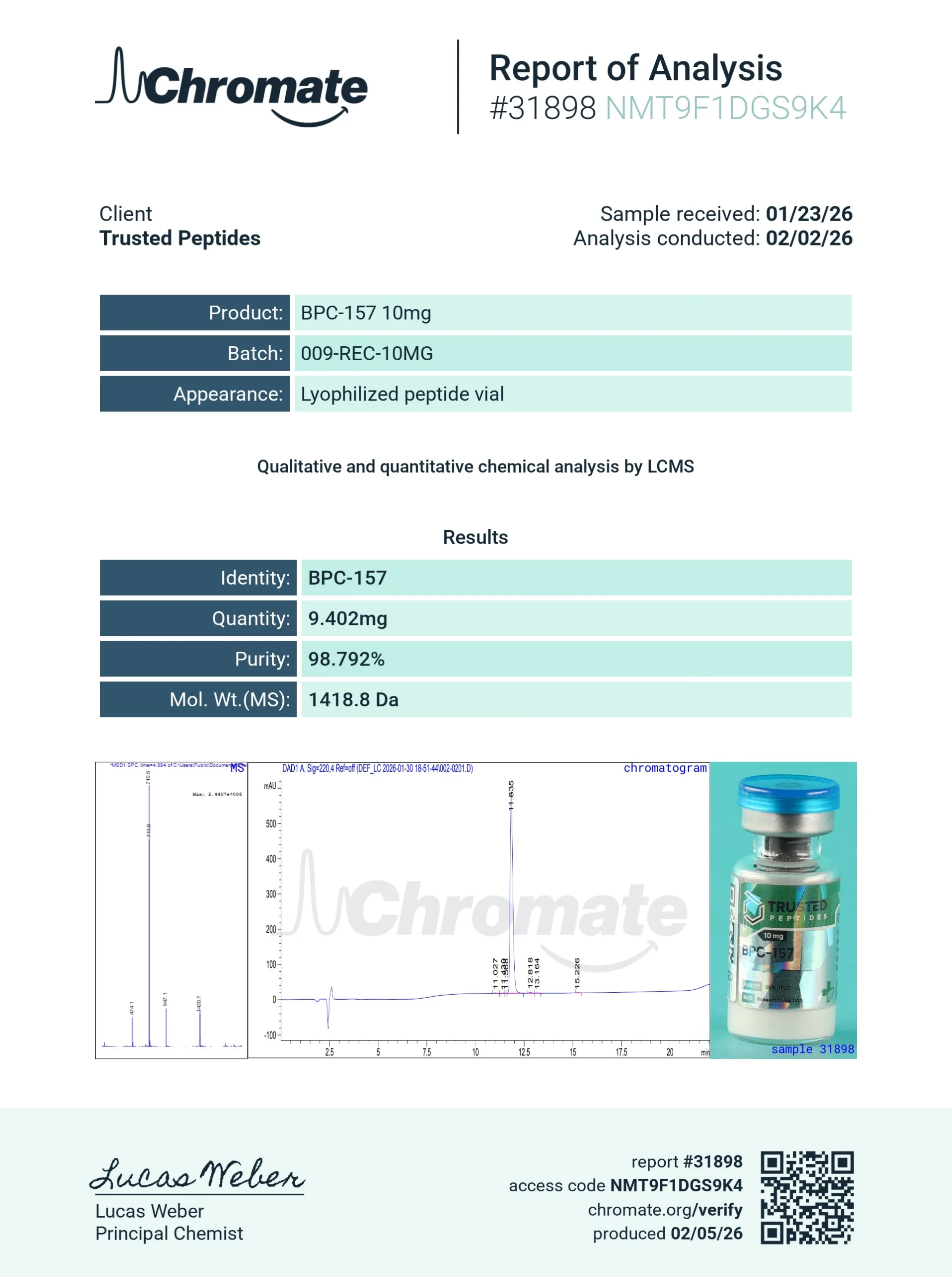 Trusted Peptides supplies BPC-157 as a lyophilized (freeze-dried) powder intended for laboratory workflows. For research reproducibility, peptide identity and purity are commonly verified using: